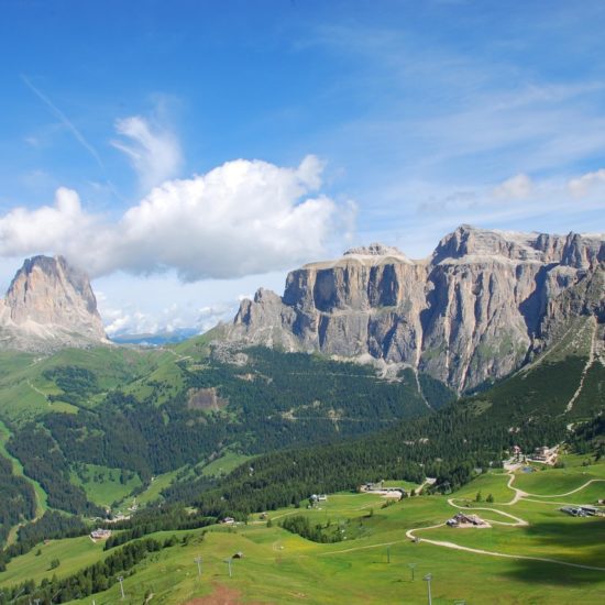 Mattina escursione al Passo Pordoi con visita del monumento a Fausto Coppi e comoda passeggiata fra i prati fino al Sacrario dei Caduti austro-ungarici e germanici delle ultime due Guerre Mondiali. Potremo ammirare il versante orientale del Passo con i paesi di Livinallongo e Arabba che si trovano nella regione del Veneto. Chi lo desidera può salire in funivia ai 2950 metri del Sass Pordoi. Pranzo al sacco (2 panini farciti, insalata di riso, frutto e acqua minerale) fornito dall’hotel e rientro nel primo pomeriggio.