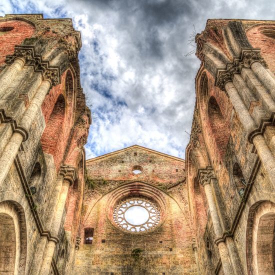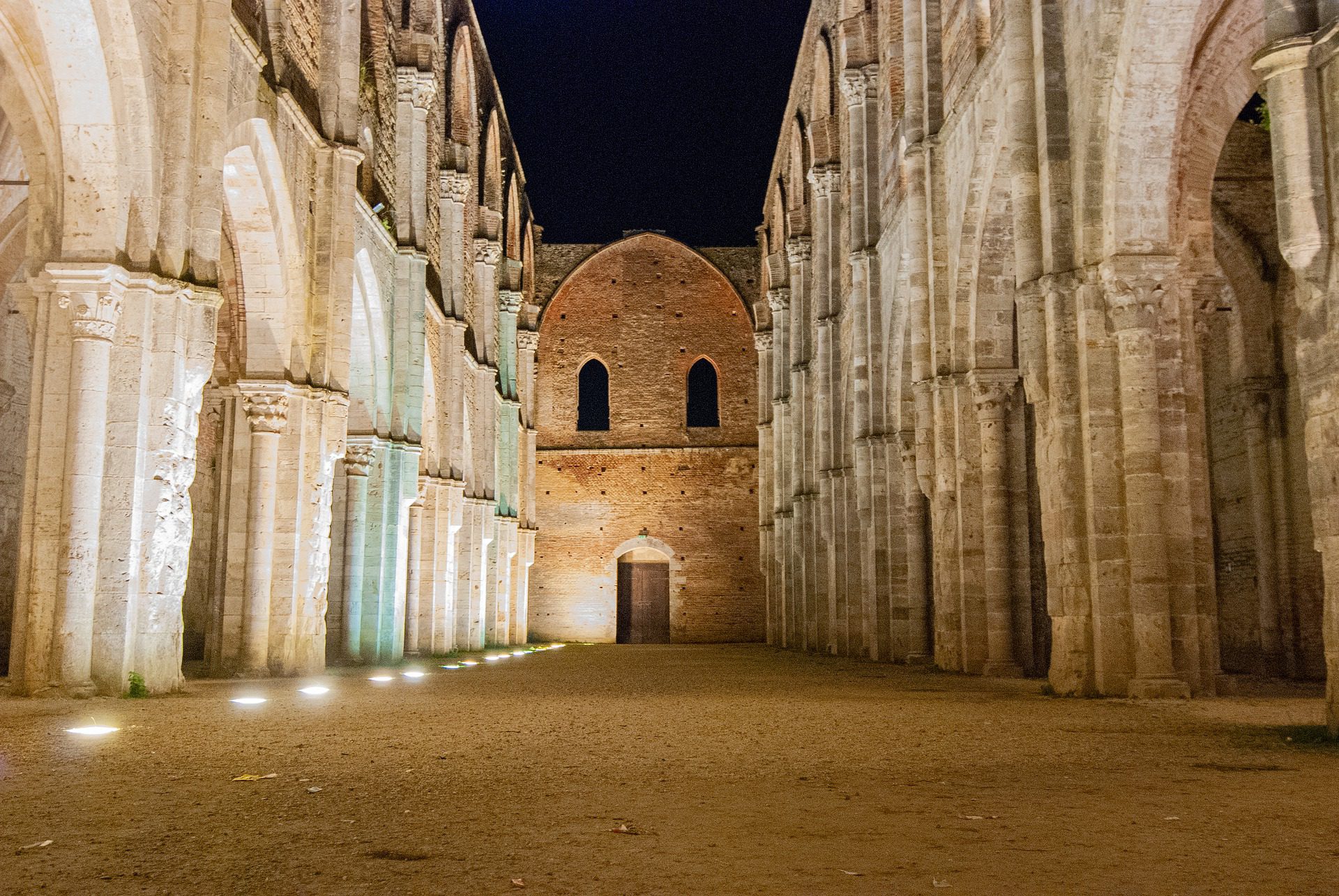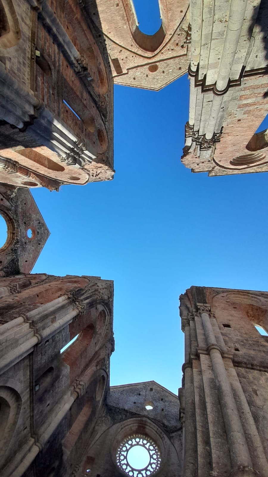l’Abbazia di San Galgano, gioiello perfetto di arte monastica cistercense del XIII sec.