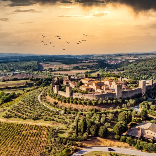Costruito fra il 1213 e il 1219 su una delle colline senesi, con finalità strategiche e militari, Monteriggioni è un incantevole borgo medievale