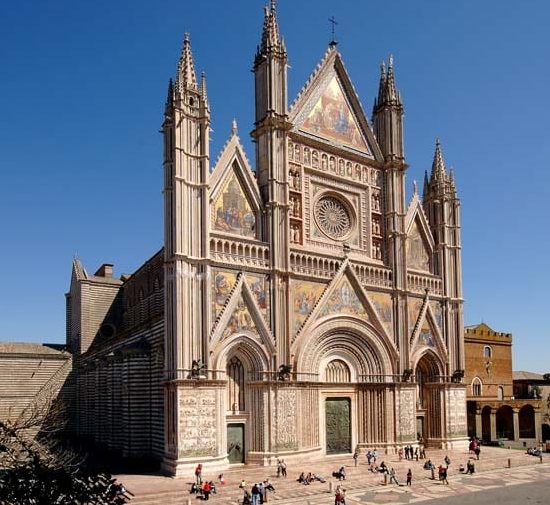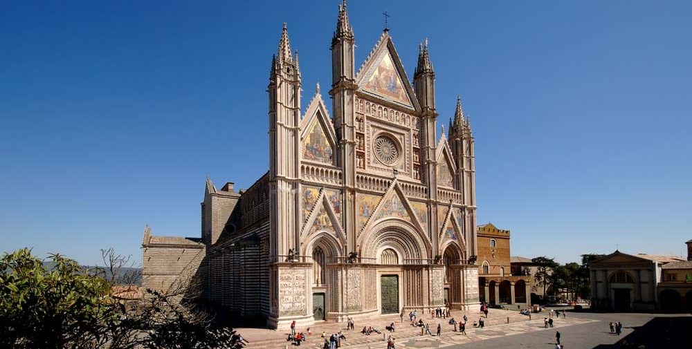 La prima pietra del Duomo fu posta nel 1290 dal Papa Niccolò IV e i lavori si protrassero per circa tre secoli. La costruzione fu finanziata da oboli dei cittadini orvietani che speravano così di ottenere delle indulgenze. La facciata, eseguita su disegno del Maitani si sviluppa armonicamente sia in larghezza che in altezza (52 mt.) ed è impreziosita dallo splendido rosone, opera dello scultore trecentesco Andrea Orcagna. All’interno della Cattedrale, si possono ammirare la Cappella che custodisce il SS. Corporale (abbellita dagli affreschi di Ugolino di Prete Ilario e dalla presenza del Reliquiario in smalti traslucidi di Ugolino di Vieri) e la Cappella di San Brizio, ove si può ammirare lo splendido ciclo di affreschi di Luca Signorelli.